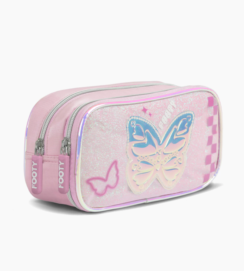 Frente con glitter, pvc estampado y aplique de mariposa en holograma