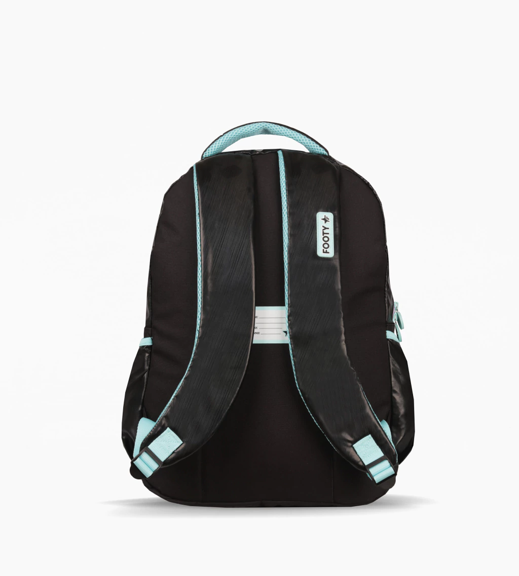 Tela satinada en toda la mochila con FOOTY bordado 3D en el frente. Cierres multicolor degrade.