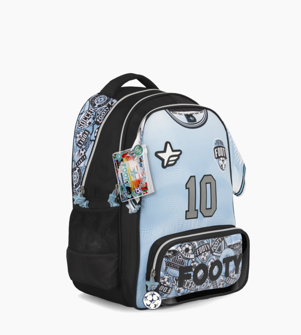 Estampa sublimada, al frente camiseta de fútbol y apliques bordados