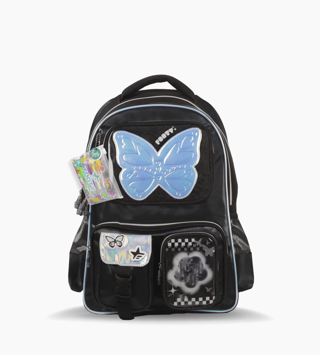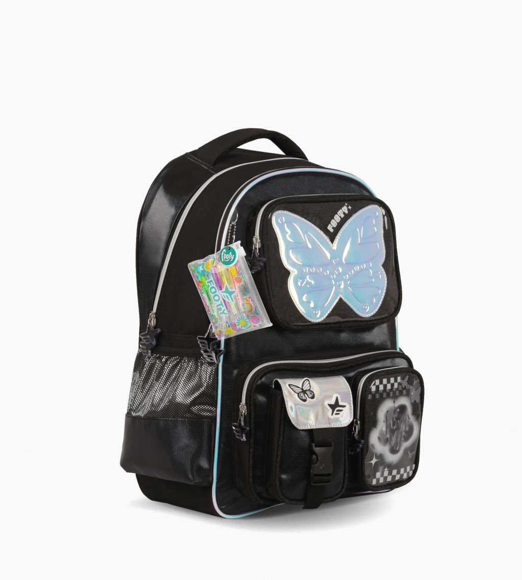 4 bolsillos frontales con apliques de glitter pcv y apliques de holograma y rubber