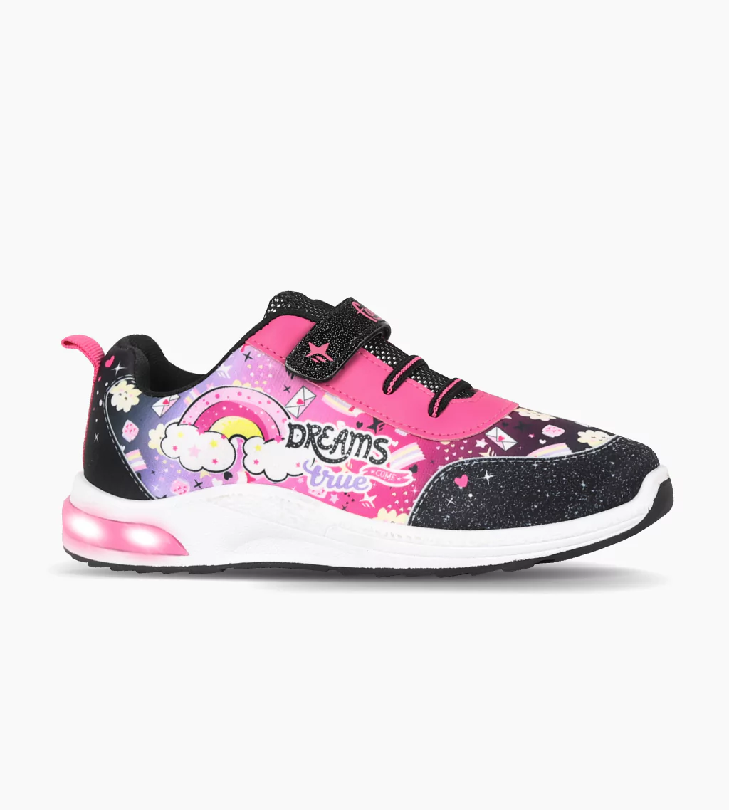 Zapatillas POP ideal para uso diario con luz al pisar. Capellada confeccionada en material textil. Sistema de ajuste con abrojo y elástico. Lengueta acolchonada con mesh. Suela liviana con exterior de goma antidelizante para un mejor agarre. Puntera y talón reforzados.