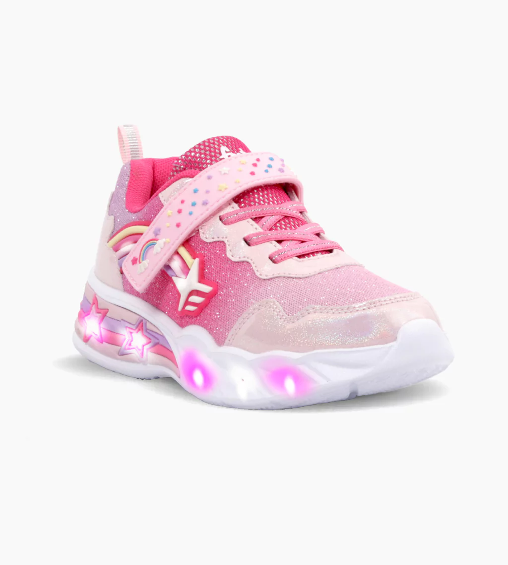 Modelo de diseño deportivo con luz al pisar ideales para el día a día, capellada confeccionada en materiales sinteticos estampados. Sistema de ajuste con abrojo y cordon elastico. Lengueta acolchonada de mesh, puntera y talón reforzados. Suela de EVA ultraliviana con luz bicolor al pisar